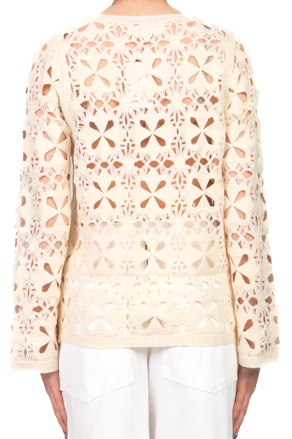 - Romantica e raffinata, questa maglia girocollo in crochet unisce lavorazione artigianale e stile contemporaneo. Le maniche lunghe donano eleganza e la rendono perfetta anche per le mezze stagioni. Ideale da abbinare a jeans o gonne per un look femminile e ricercato