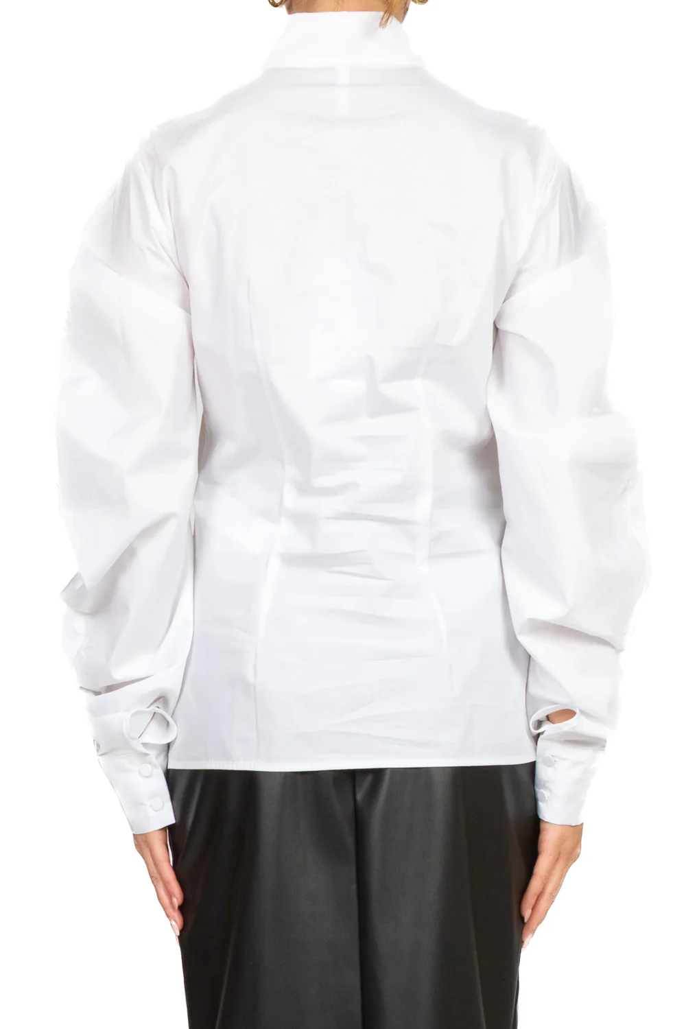 - Dal design femminile e contemporaneo, questa camicia in puro cotone si distingue per le maniche balloon, ampie e strutturate, che aggiungono volume con stile. I bottoni rivestiti in tessuto donano un tocco raffinato e coerente con la linea del capo. Perfetta per look eleganti o casual chic, è un passe-partout dal carattere deciso ma sofisticato.