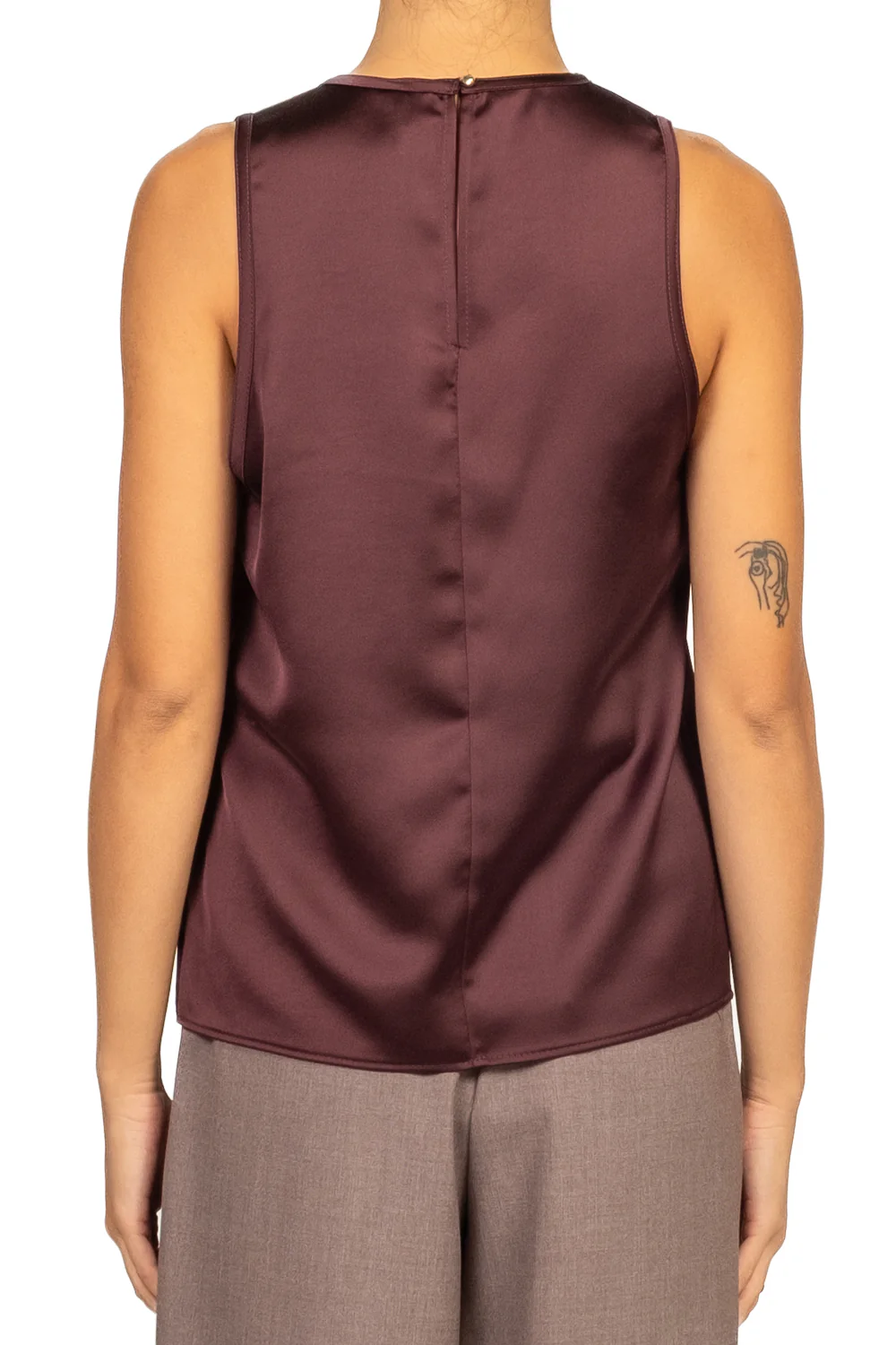 Un capo raffinato e versatile, questa canotta in satin si distingue per la sua texture lucida e morbida, perfetta per un look elegante e femminile. La chiusura con bottoncino sul retro aggiunge un dettaglio delicato e pratico. Ideale da indossare da sola o sotto giacche e blazer per outfit sofisticati.