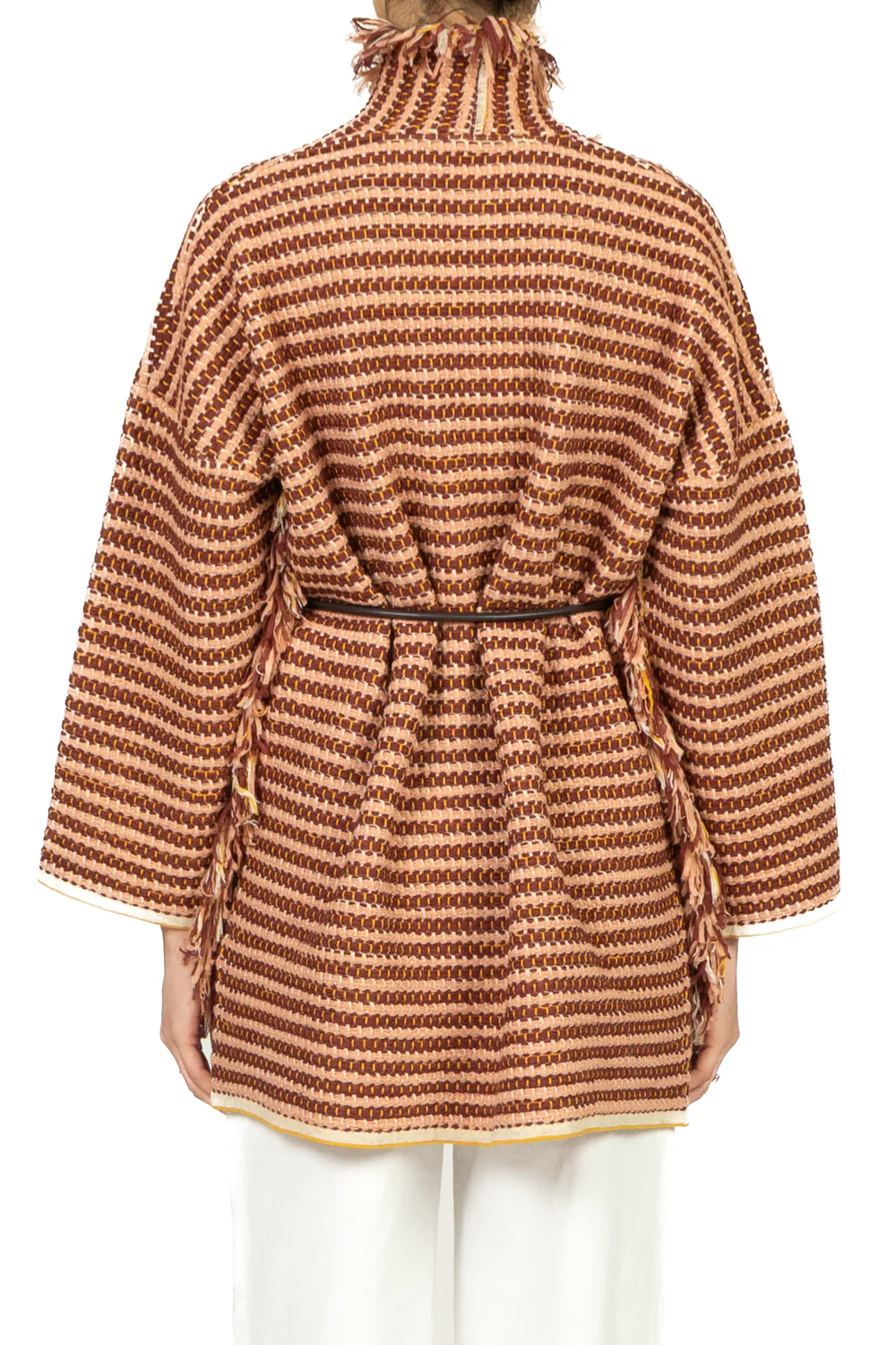 Caban in tessuto tramato, aperto sul davanti e valorizzato da cintura in ecopelle che definisce il punto vita. Le frange decorative aggiungono un tocco distintivo, mentre il taglio classico unisce eleganza e stile contemporaneo, ideale per look sofisticati e originali.