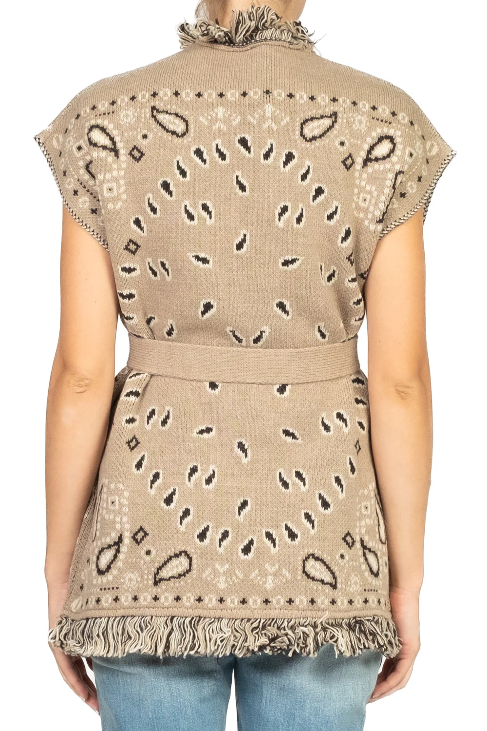questo caban smanicato in maglia è impreziosito da una vivace fantasia bandana e dettagli sfrangiati lungo i bordi per un effetto vissuto e originale. Privo di chiusure e tasche, si indossa aperto o definito in vita grazie alla cintura coordinata. Un'aggiunta audace e versatile al tuo guardaroba, perfetta per completare look casual o dare carattere agli outfit più minimal.