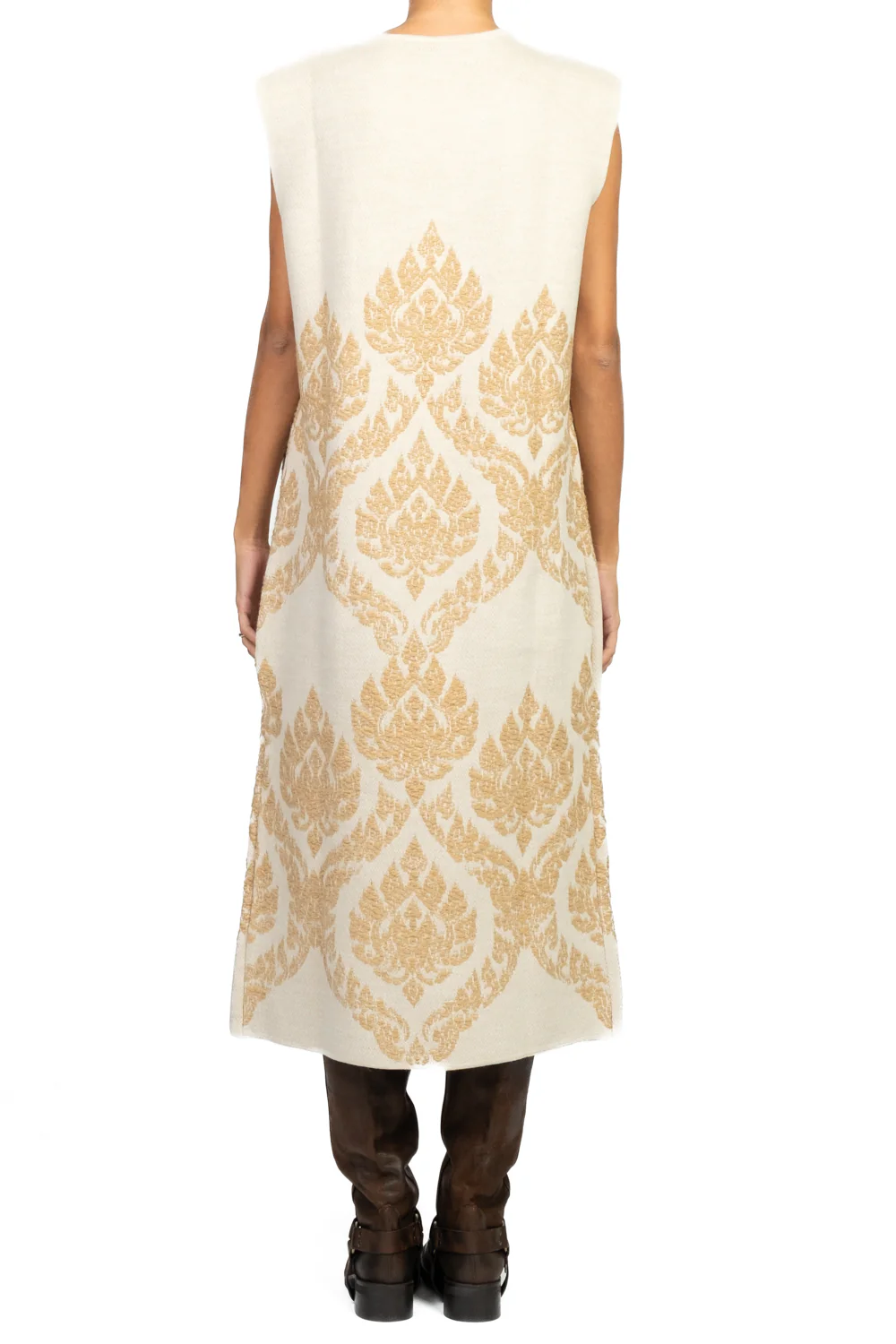 - Gilet lungo senza chiusura, arricchito da un elegante ricamo damascato e pratiche tasche laterali. Un capo sofisticato e versatile, ideale per completare con stile look sia casual che più ricercati.