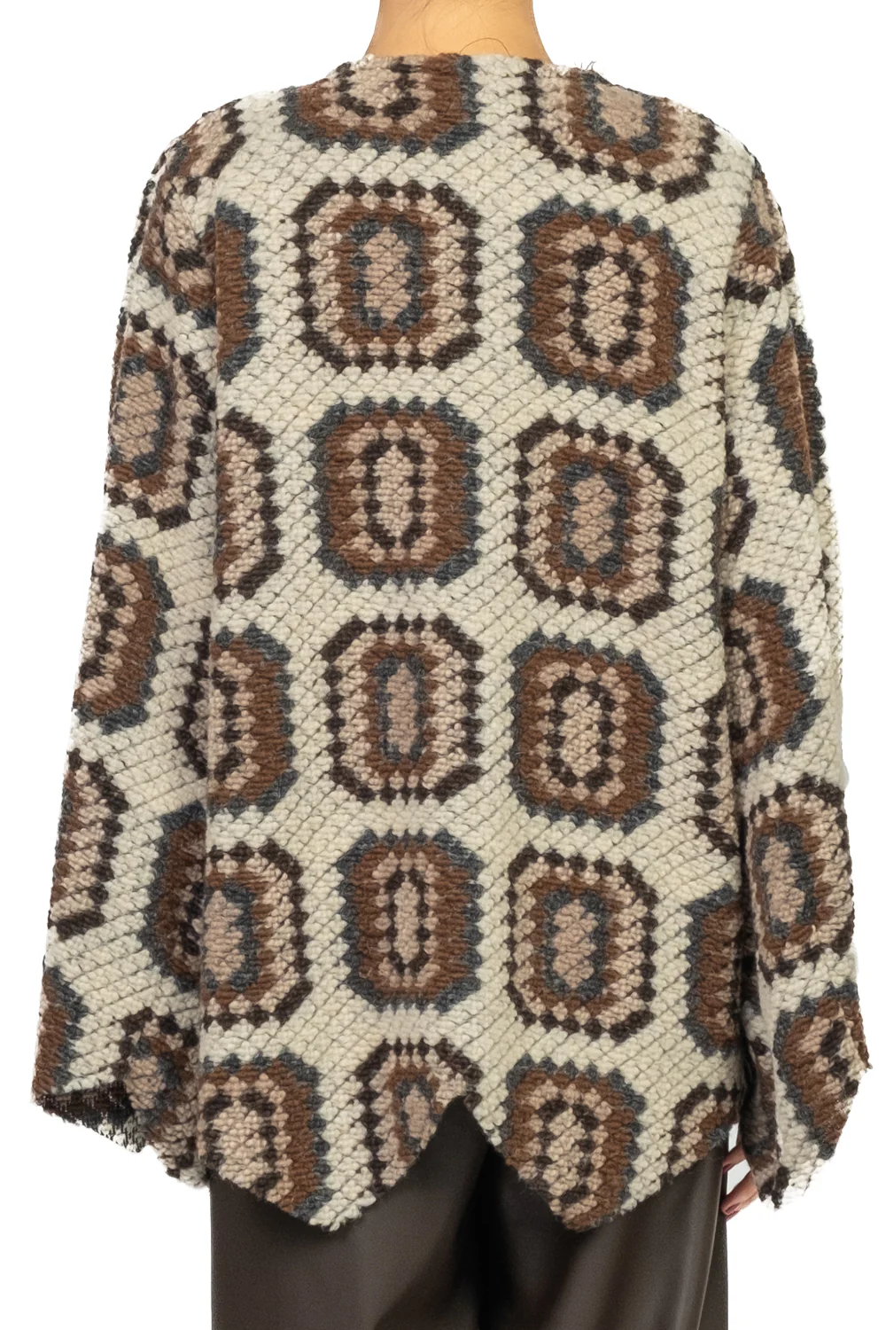 - Dal design unico e ricercato, questo caban unisce linee asimmetriche e dettagli sfrangiati per un effetto contemporaneo e raffinato. La fantasia dona movimento e carattere al capo, mentre la chiusura con spilla aggiunge un tocco originale e distintivo.