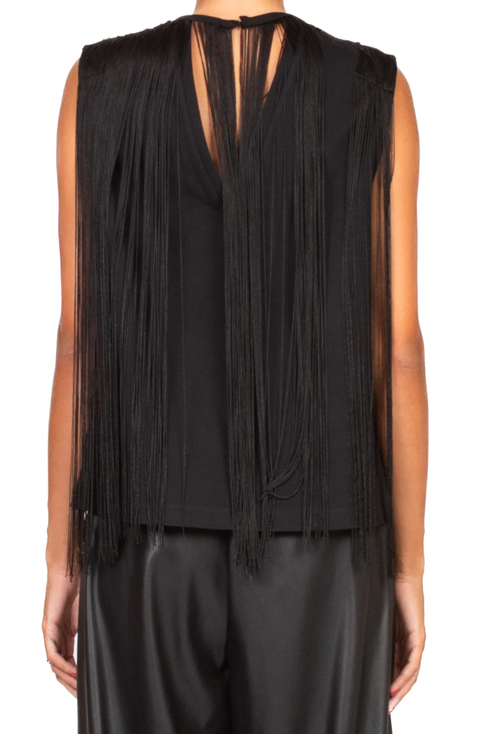 Elegante e dinamica, questa canotta in punto milano è impreziosita da un dettaglio di frange che aggiunge movimento e personalità al capo. Lo scollo a V valorizza la silhouette, mentre la chiusura con bottoncino posteriore garantisce una vestibilità comoda e curata. Perfetta da abbinare a pantaloni o gonne per un look sofisticato e moderno.