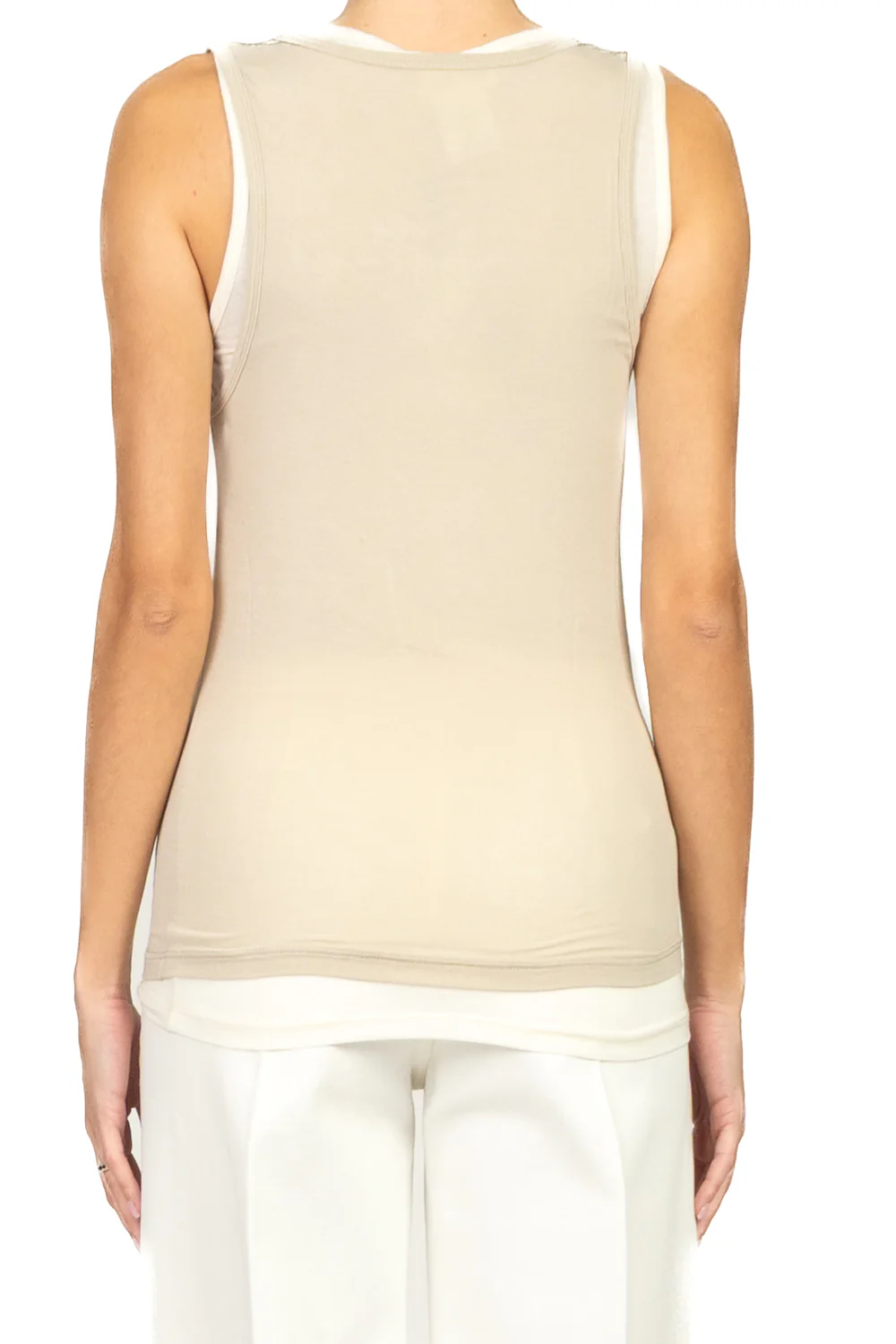 - Doppia canotta sovrapposta in misto seta, capo leggero e raffinato composto da due canotte separate, indossate una sopra l’altra ma non cucite insieme. Il tessuto in misto seta dona una sensazione morbida e fluida sulla pelle, con una leggera lucentezza che valorizza il look. Ideale per creare giochi di trasparenze e movimento, perfetta sia per outfit eleganti che casual chic.